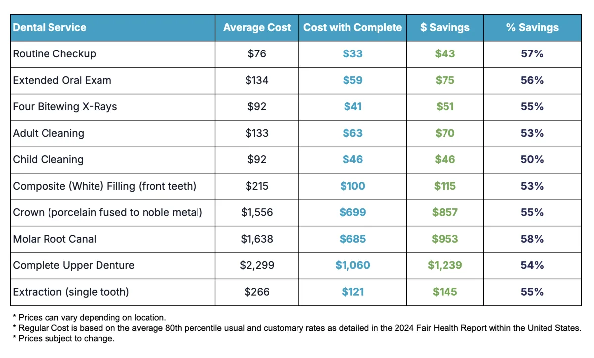 Save 20% to 50% on most dental procedures including routine oral exams, unlimited cleanings and major work such as dentures, root canals and crowns