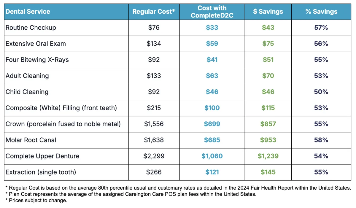 CompleteD2C’s savings plans aren’t insurance, but they’re a smart way to save money on health care. Our affordable plans give you access to discounts on a wide range of products and services — whether you have insurance or not. For a small monthly fee, you can visit participating providers who offer dental, vision, and other services at special reduced rates just for our members. It’s a simple, flexible way to lower your health care costs and get the care you need.